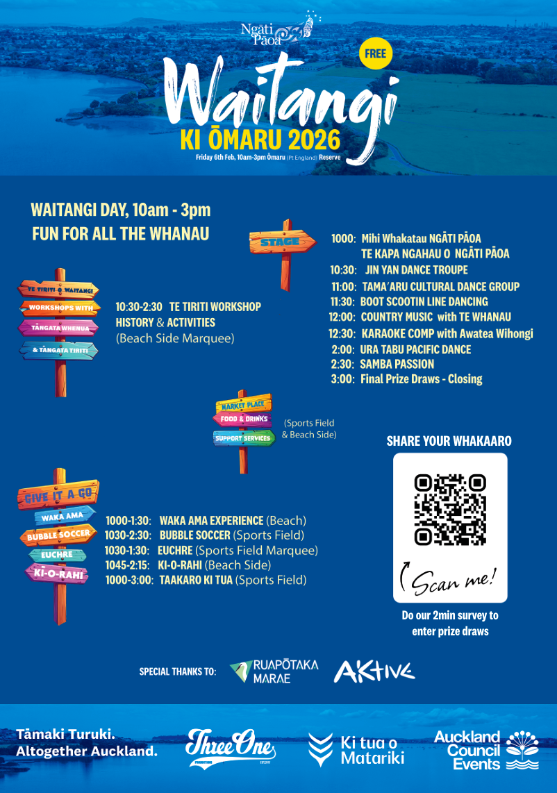 Join us on Friday 6 February, 10am–3pm for Waitangi ki Ōmaru 2026 — a free, fun and interactive whānau event celebrating our national day. At Pt England Reserve, Point England Rd.